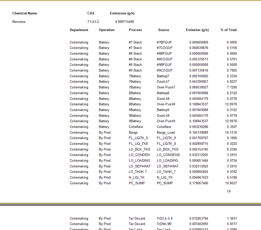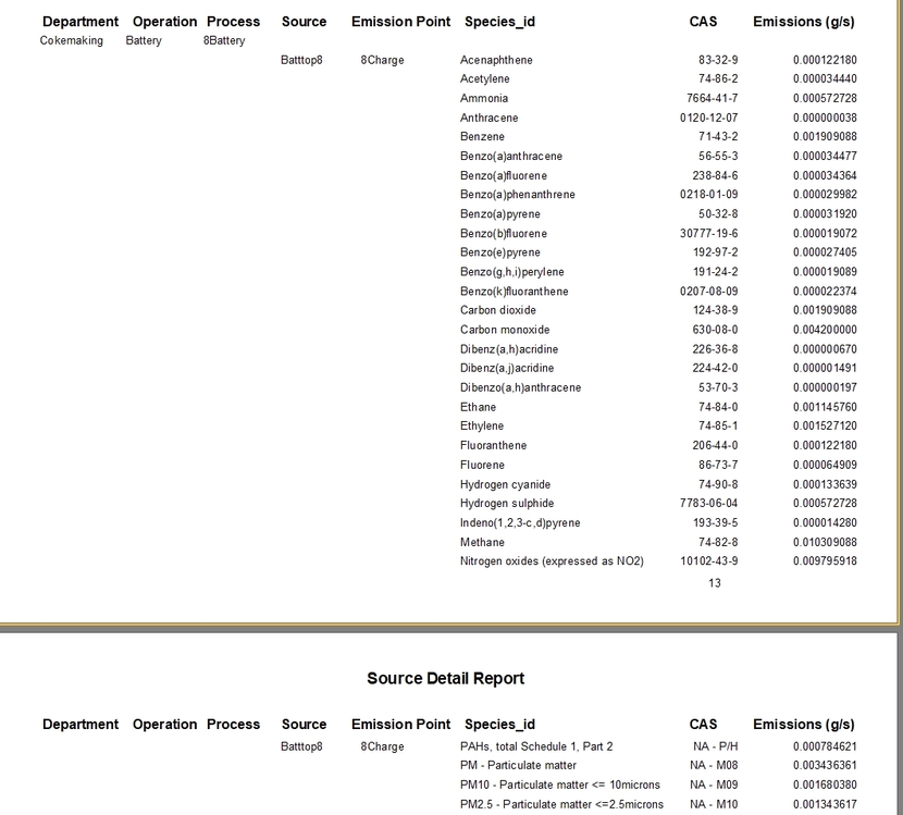 Extensive reporting facilities including source emission summary which lists all chemical emissions from each source or a list of all sources which emit a selected chemical. The latter also permits the generation of detailed emissions by emission point as required for modeling input.