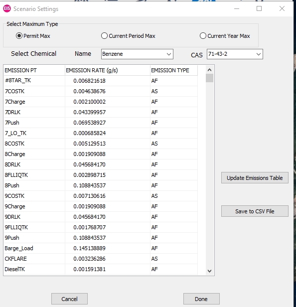 The Emission Points tab shows a list of the emission points for the facility and displays the emission rate of all chemicals from this emission point as calculated by the stream procedure.