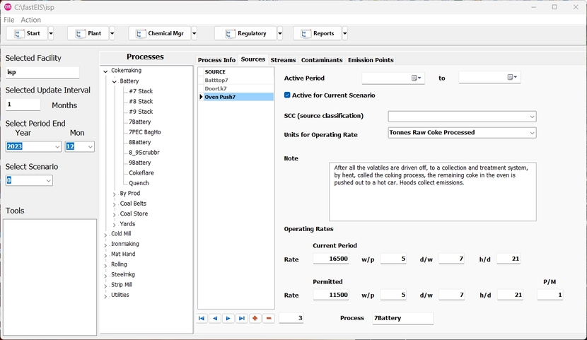 The database stores entered and calculated data for each reporting period. By selecting the period the user is presented with a snapshot of the data for the period, and any changes affect only the data for the selected period. The data is organized by process as seen in the facility tree on the left panel, further grouped by operation and department.