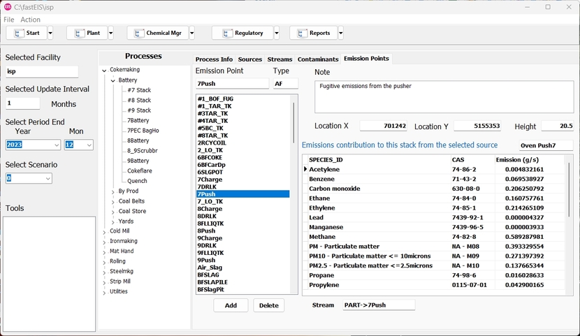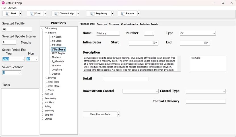 Sophware has developed the fastEIS Windows interface which provides the facilities for creating a comprehensive description of a facility of any size by describing every process in terms of its sources of emissions, their full composition, and the emission points receiving the emission streams.