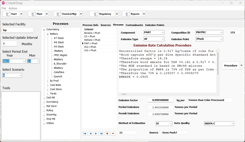 The data describing the process, source and emission streams is stored in a database and provides a historical record of any changes over time. The user creates the emission rate calculation procedures which can range from simple emission factors to complex computations written in MS Basic.