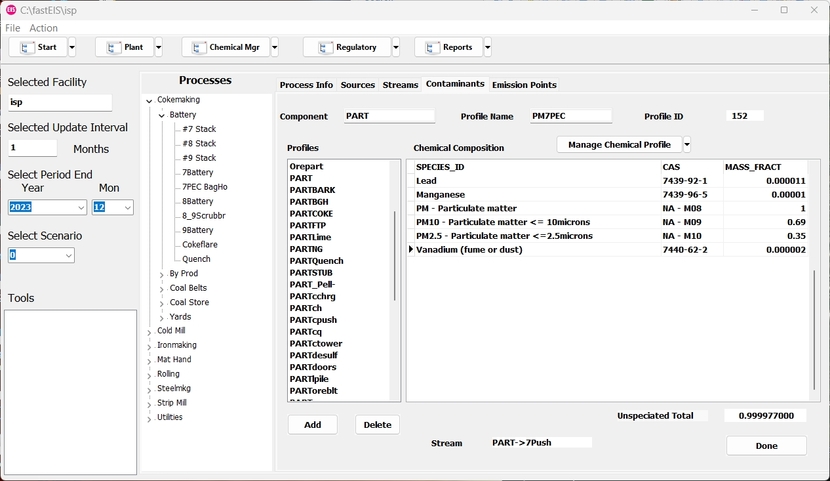 All of the data is generated and maintained in a SQLite database available to the user for listing, searching and specialized reporting. The database is maintained historically so that the user can see each period of operation in full since inception of the database. If any changes are needed to process, source, or stream definitions and procedures, these are marked with start and end dates so that prior reporting periods are reproduced correctly irrespective of the current state of the facility description.