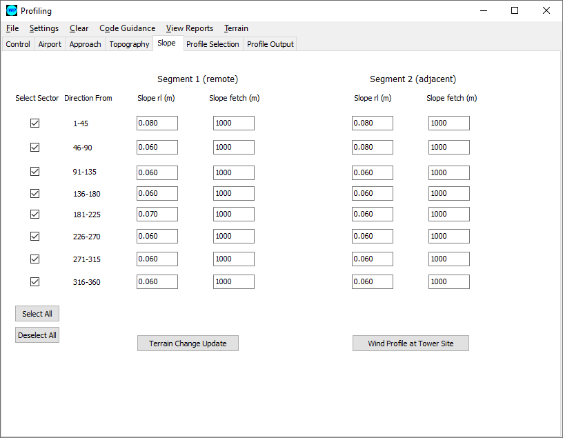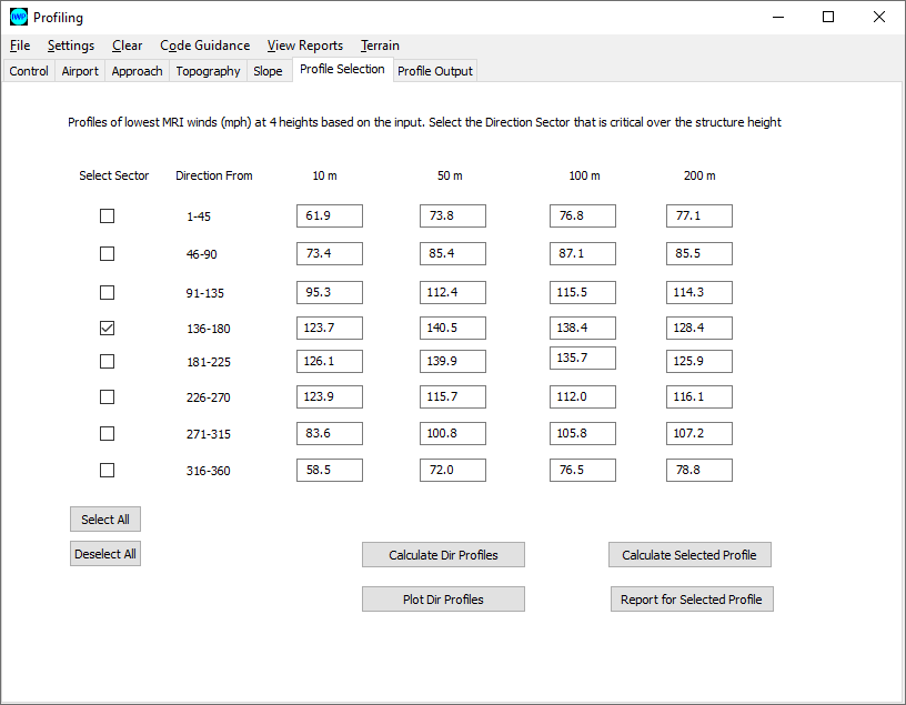 When all of the data has been entered, the Profile Selection Tab provides to the user the option to calculate the profiles, which fills in the wind speed at four heights for each sector allowing the user to determine the sector which produces the worst case wind depending on the height of the tower or structure.