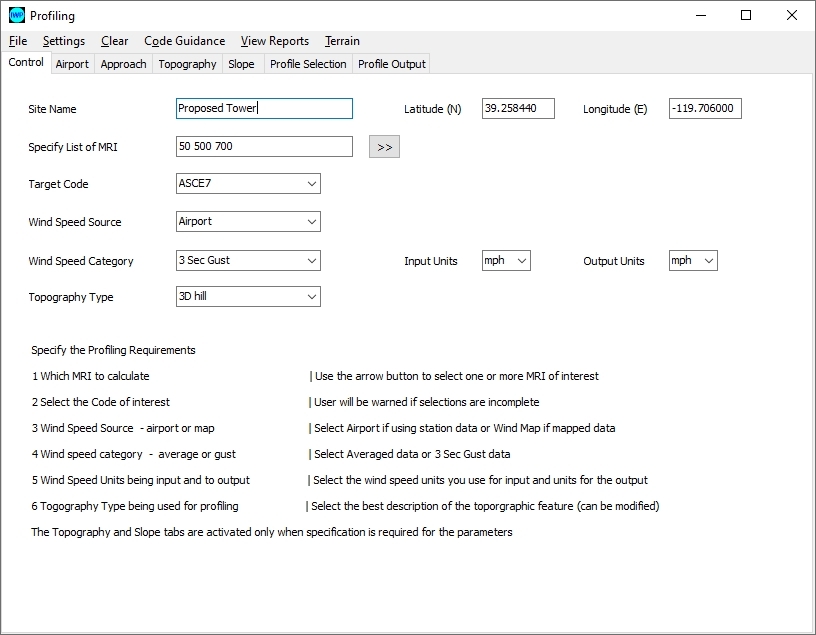 The User Interface shown below provides a number of Tabbed Panels for specifying Control parameters, Basic Wind data, and calculating procedures for the wind profile arriving at the base of the topographic feature, the wind speed up profile changes, and the changes in roughness on the slope.