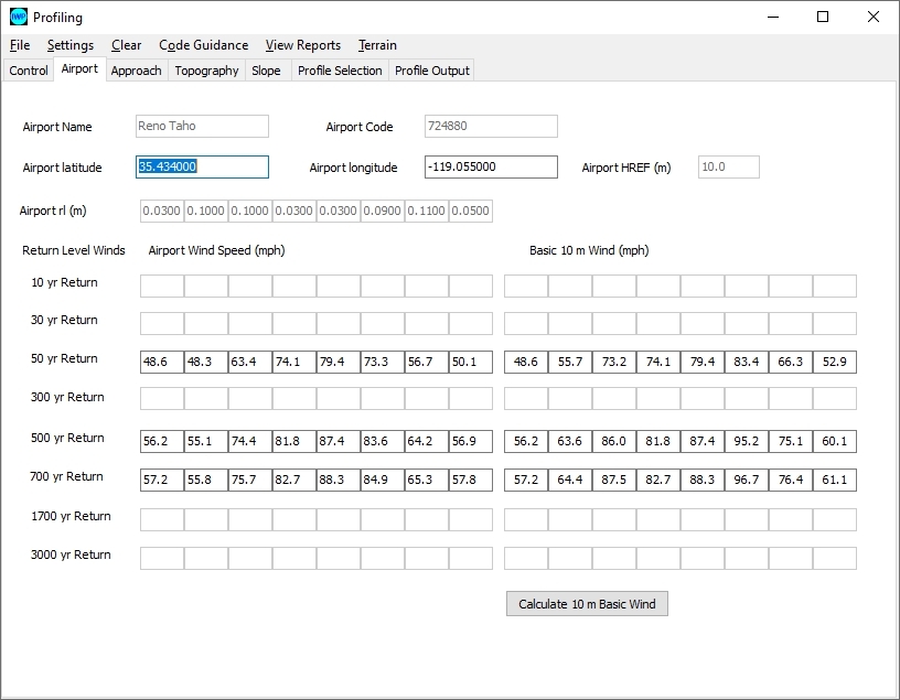 The Profile approach for dealing with this issue is to perform a directional extreme wind determination based on the nearest observing station data. This involves sampling of the long term data for each of eight directional sectors and performing the extreme wind statistics including return period determination for all required MRI followed by conversion of the observed extreme wind to Basic Wind specification by determining the directional roughness and topography at the airport. The resulting directional extreme basic wind can then be applied at the selected site with the sectoral roughness and topographic parameters.