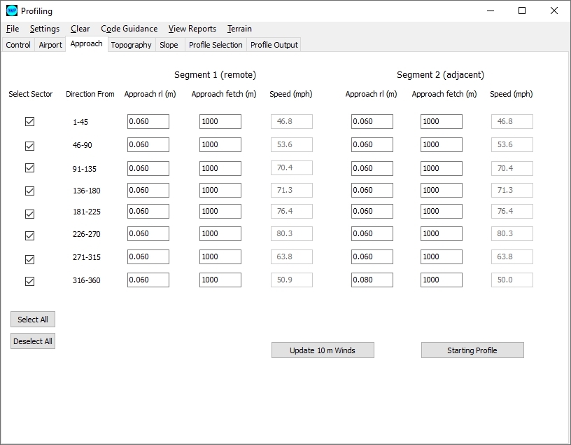 On the Approach tab the user specifies the terrain roughness lengths for each sector on the fetch to the base of the topographic feature. Where there is a change in roughness along the fetch, the user specifies the roughness in two separate segments.
