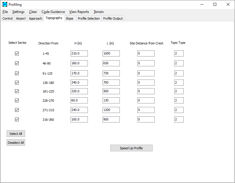 On the topography tab the user specifies the feature type and the steepest slope for each sector.